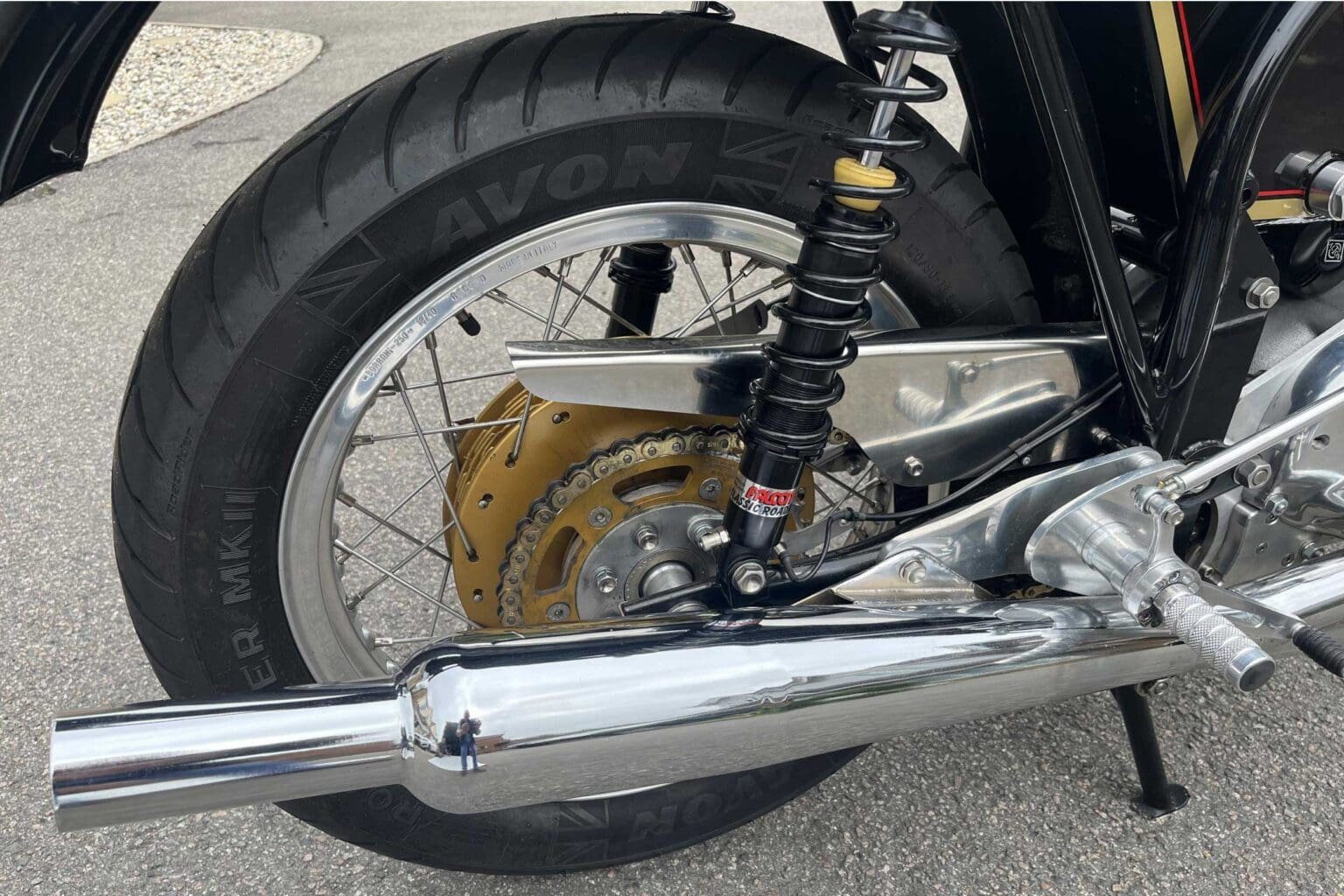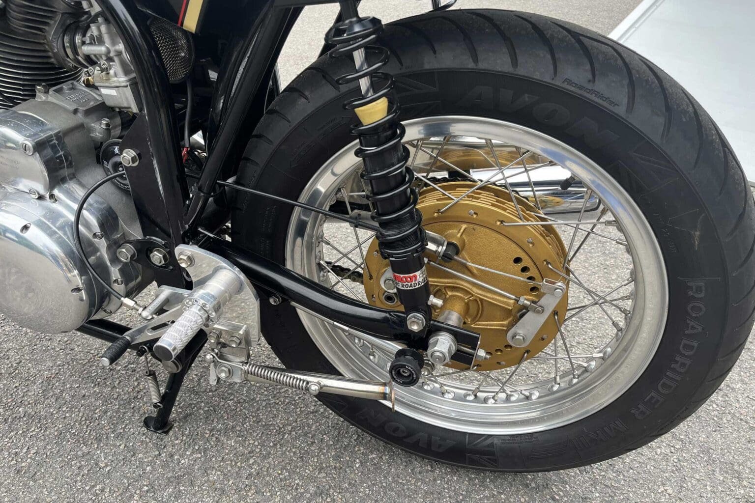 That front brake draws attention. It’s 250mm in diameter – around 10 inches – and created by Fontana. It’s said to have more stopping power than a disc brake and cost more than £2,600 on its own.