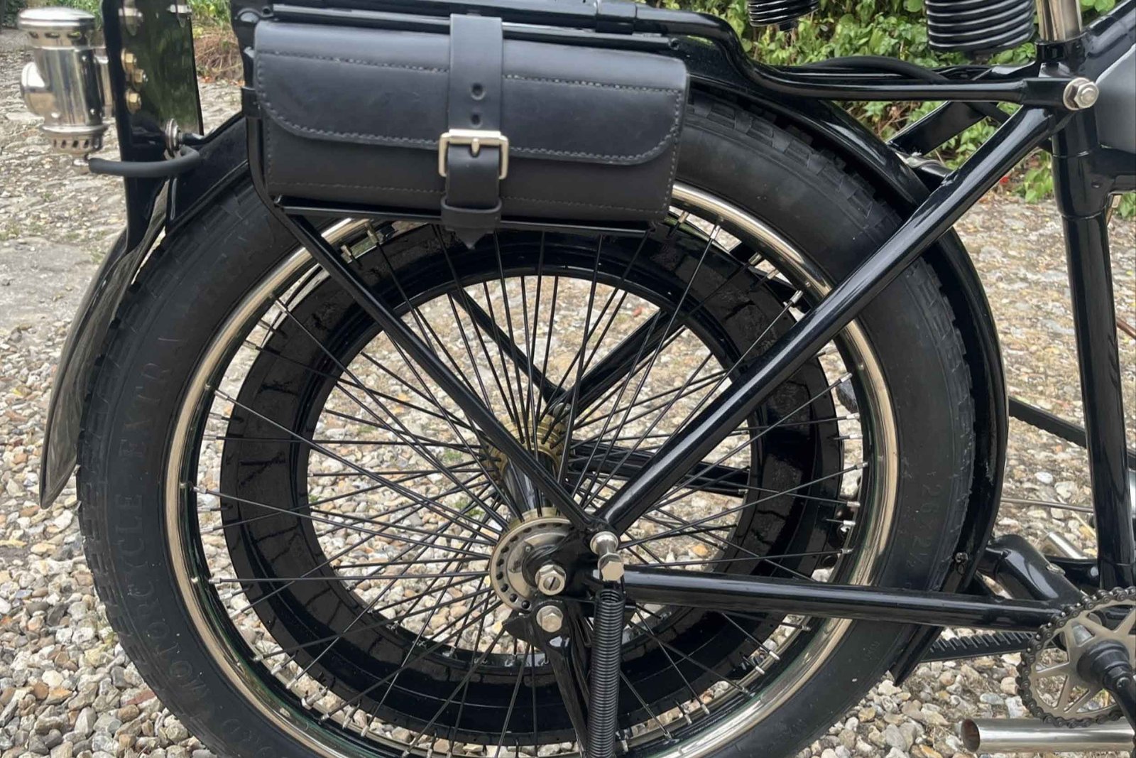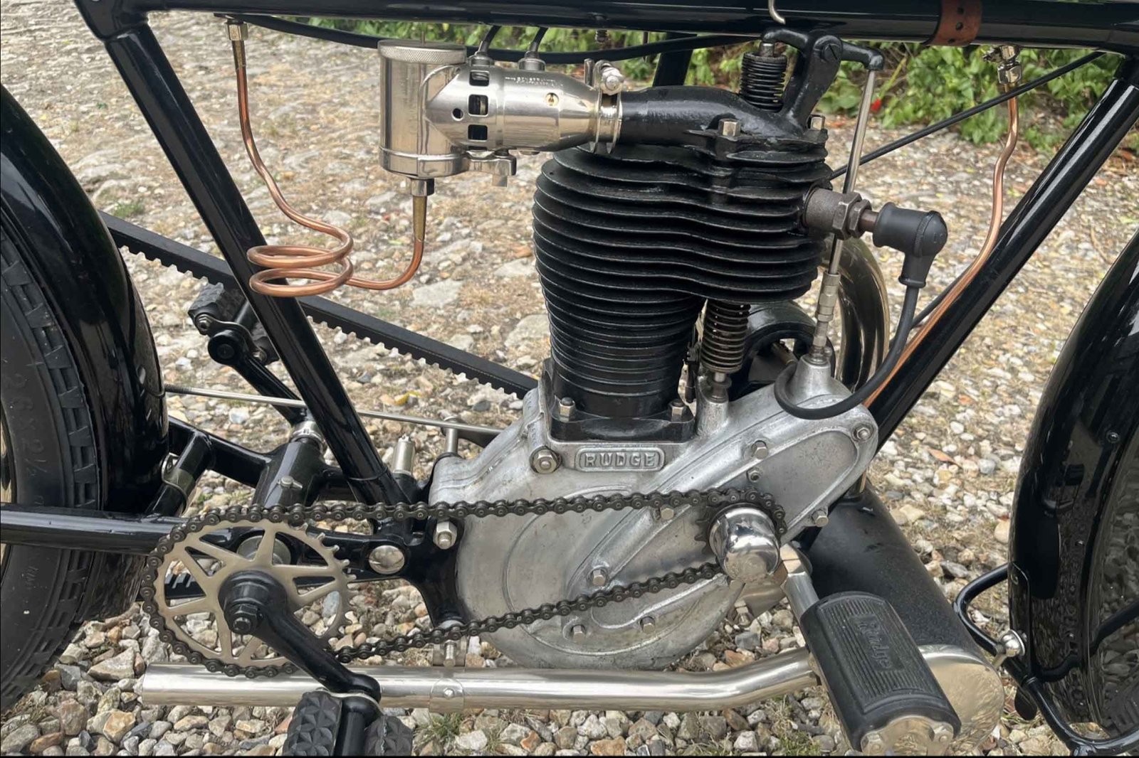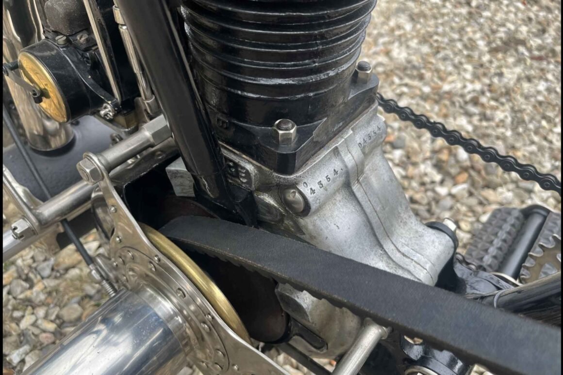 The chassis was built around a simple diamond frame, and many references note Rudge’s enclosed-spring front fork arrangement—an early attempt to add control and comfort on rough roads that were often closer to compacted gravel than tarmac. Wheels were typically shod with 650 x 65mm beaded-edge tyres, and braking was very much of its time: a single shoe acting on the rear belt rim, with a stirrup-type brake on the front rim.