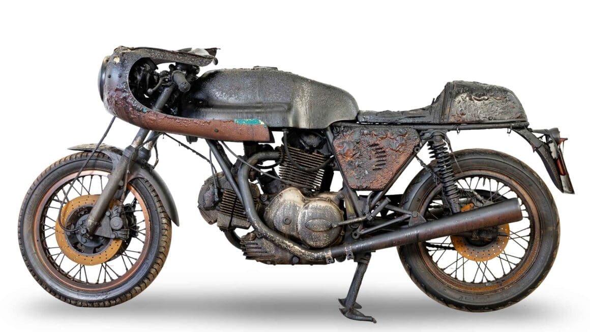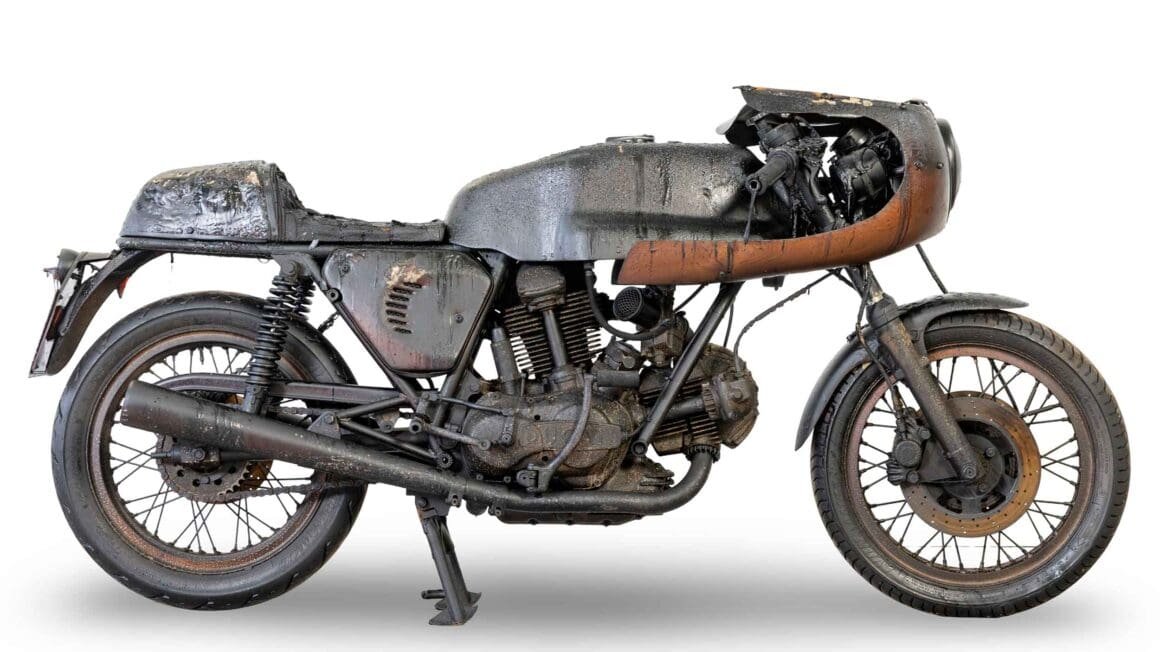 That’s the strange fate of this 1974 Ducati 750SS, raced twice around the Mountain Course by British privateer star Charlie Sanby, and now on the block at Bonhams following storage in a sealed container that survived a fire. It’s a project, it’s a relic, and it’s properly documented.